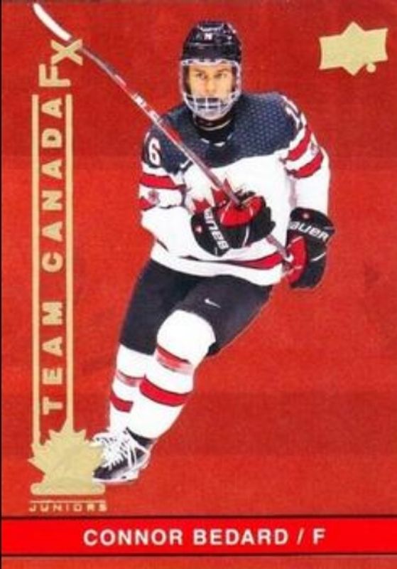 The Connor Bedard 2023 Upper Deck Team Canada Juniors #FX-17 Team Canada FX Rookie card is 1 of 78 Connor Bedard's card variations in the 2023 Upper Deck Team Canada Juniors set being tracked by Sports Card Investor, including #65 Base, #8 Base, #141 Base, #108 Base, and #65 Clear Cut.