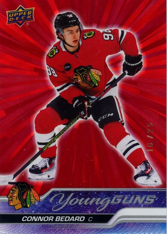 The Connor Bedard 2023 Upper Deck #451 Young Guns - Outburst Red /25 Rookie card in Raw condition has not changed in price in the last 30 days and was last sold for $7,574.10 .