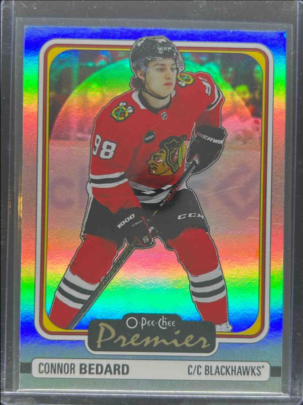 The Connor Bedard 2024 O-Pee-Chee #P-66 O-Pee-Chee Premier card is 1 of 26 Connor Bedard's card variations in the 2024 O-Pee-Chee set being tracked by Sports Card Investor, including Base, Blue Border, Red Border, Yellow Border, and Orange Border /25.