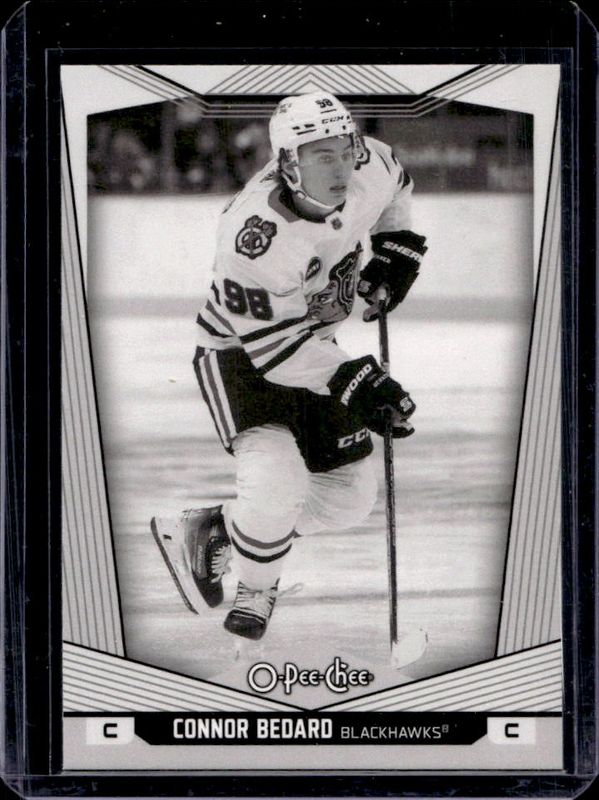 The Connor Bedard 2024 O-Pee-Chee #156 Variants - Black & White Test Proof card is 1 of 26 Connor Bedard's card variations in the 2024 O-Pee-Chee set being tracked by Sports Card Investor, including Base, Blue Border, Red Border, Yellow Border, and Orange Border /25.