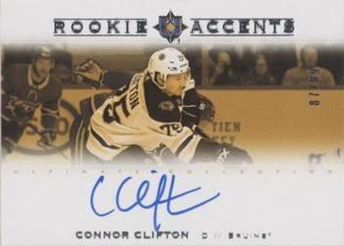 The Connor Clifton 2019 Upper Deck Ultimate Collection #RA-CC Rookie Accents /99 card is 1 of 8 Connor Clifton's card variations in the 2019 Upper Deck Ultimate Collection set being tracked by Sports Card Investor, including Base /299, Ultimate Introductions, Ultimate Introductions Gold Autographs, Retro Ultimate Rookies Autographed /125, and Ultimate Introductions - Onyx Black /25.