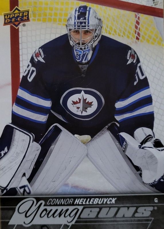 The Connor Hellebuyck 2015 Upper Deck #214 Young Guns - Jumbo Rookie card in Raw condition has not changed in price in the last 30 days and was last sold for $1.37 .