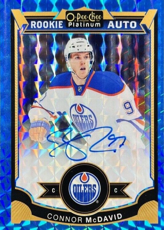The Connor McDavid 2015 O-Pee-Chee Platinum #190 Rookie Autographs - Blue Cubes /35 card in Raw condition has not changed in price in the last 30 days and was last sold for $6,202.03 .