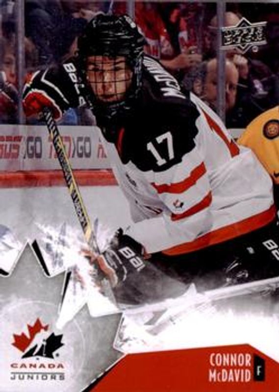 The Connor McDavid 2015 Upper Deck Team Canada Juniors #90 Base Rookie card is 1 of 46 Connor McDavid's card variations in the 2015 Upper Deck Team Canada Juniors set being tracked by Sports Card Investor, including #49 Base, #98 Base, #49 Gold, #98 Gold, and #90 Gold.