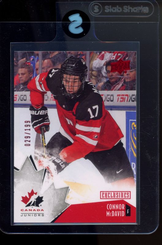 The Connor McDavid 2015 Upper Deck Team Canada Juniors #98 Exclusives /199 Rookie card is 1 of 46 Connor McDavid's card variations in the 2015 Upper Deck Team Canada Juniors set being tracked by Sports Card Investor, including #49 Base, #98 Base, #90 Base, #49 Gold, and #98 Gold.