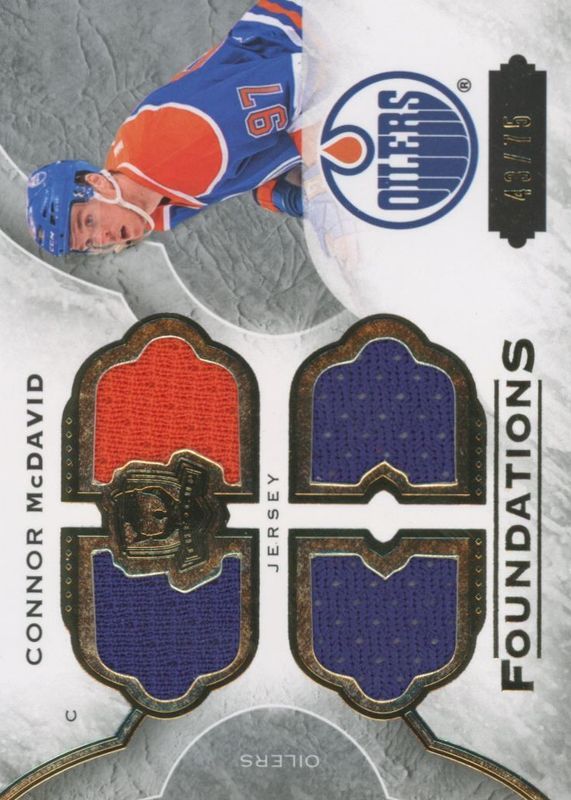 The Connor McDavid 2015 Upper Deck The Cup #CF-CM Cup Foundations Quad Jersey /75 Rookie card in Raw condition has not changed in price in the last 30 days and was last sold for $704.34 .