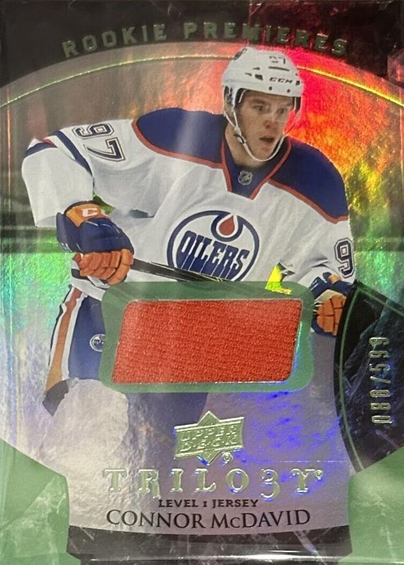 The Connor McDavid 2015 Upper Deck Trilogy #101 Level 1 - Rookie Premieres Jersey - Green Rainbow Foil /599 card in Raw condition has not changed in price in the last 30 days and was last sold for $142.21 .