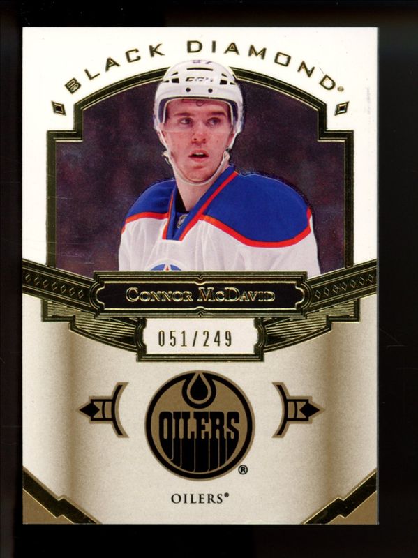 The Connor McDavid 2016 Upper Deck Black Diamond #BDB-CM Base /249 card is 1 of 15 Connor McDavid's card variations in the 2016 Upper Deck Black Diamond set being tracked by Sports Card Investor, including Relics /149, Pure Black Signatures /99, Pure Black Prime Relics /50, Team Logo Jumbo Manufactured Patches, and 2016 Upper Deck Exquisite Collection /149.