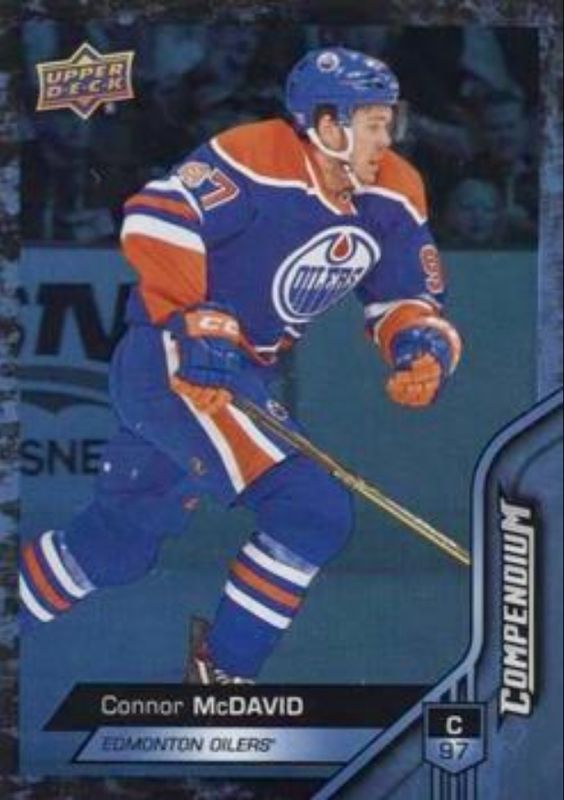 The Connor McDavid 2016 Upper Deck Compendium #SP-3 SP Achievement Blue card is 1 of 12 Connor McDavid's card variations in the 2016 Upper Deck Compendium set being tracked by Sports Card Investor, including Blue, Gold, Red, Printing Plates Black /1, and Printing Plates Cyan /1.