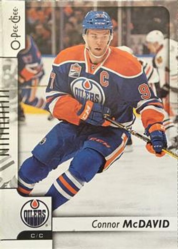 The Connor McDavid 2017 O-Pee-Chee Blaster Box Bottoms card is 1 of 38 Connor McDavid's card variations in the 2017 O-Pee-Chee set being tracked by Sports Card Investor, including #555 Base, #561 Base, #599 Base, #97 Base, and #555 Rainbow Foil.