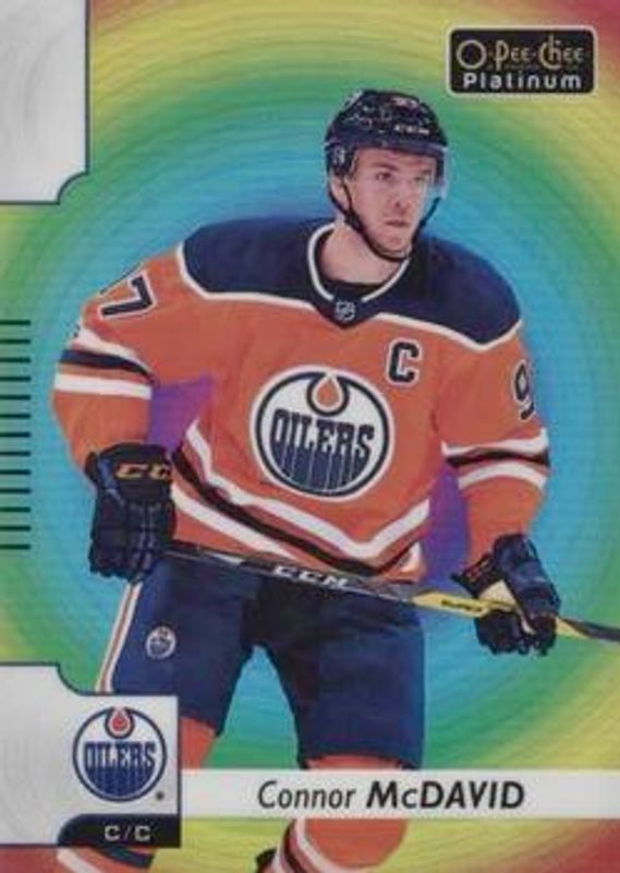 The Connor McDavid 2017 O-Pee-Chee Platinum #PV-1 Rainbow Color Wheel Photo Variations card is 1 of 32 Connor McDavid's card variations in the 2017 O-Pee-Chee Platinum set being tracked by Sports Card Investor, including Base, Rainbow, Violet Pixels, Red Prism /199, and Royal Blue Cubes /99.