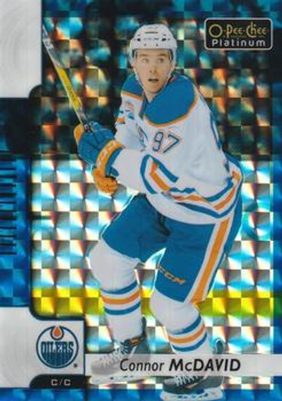 The Connor McDavid 2017 O-Pee-Chee Platinum #50 Royal Blue Cubes /99 card is 1 of 32 Connor McDavid's card variations in the 2017 O-Pee-Chee Platinum set being tracked by Sports Card Investor, including Base, Rainbow, Violet Pixels, Red Prism /199, and Seismic Gold /50.