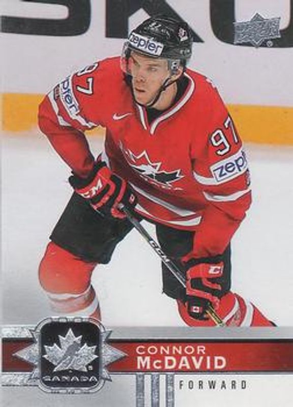 The Connor McDavid 2017 Upper Deck Team Canada #1 Base card is 1 of 31 Connor McDavid's card variations in the 2017 Upper Deck Team Canada set being tracked by Sports Card Investor, including #141 Base, #128 Base, #128 Gold Foil Signatures, #141 Gold Foil Signatures, and #1 Gold Foil Signatures.