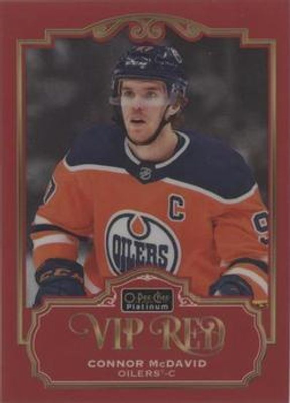 The Connor McDavid 2019 O-Pee-Chee Platinum #VIPR-CM VIP Red /50 card is 1 of 27 Connor McDavid's card variations in the 2019 O-Pee-Chee Platinum set being tracked by Sports Card Investor, including #150b Base, #150 Base, #150 Matte Pink, #150 Pond Hockey, and #150 Rainbow.