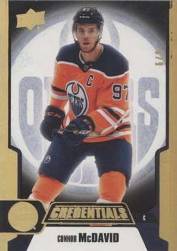The Connor McDavid 2019 Upper Deck Credentials #1 Black /1 card is 1 of 22 Connor McDavid's card variations in the 2019 Upper Deck Credentials set being tracked by Sports Card Investor, including Base /699, Red /99, Green /25, Purple /10, and Colorful Characters.