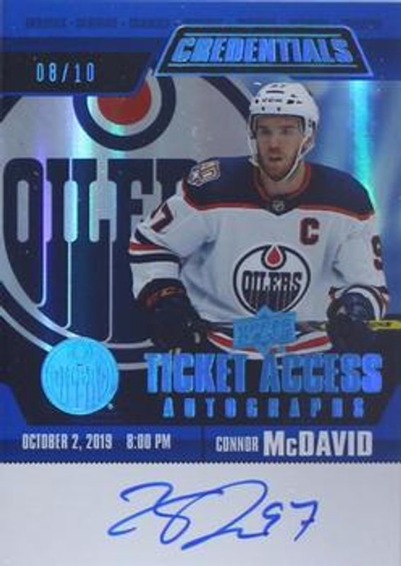 The Connor McDavid 2019 Upper Deck Credentials #TAAV-CM Ticket Access Autographs Photo Variant /10 card is 1 of 22 Connor McDavid's card variations in the 2019 Upper Deck Credentials set being tracked by Sports Card Investor, including Base /699, Red /99, Green /25, Purple /10, and Black /1.