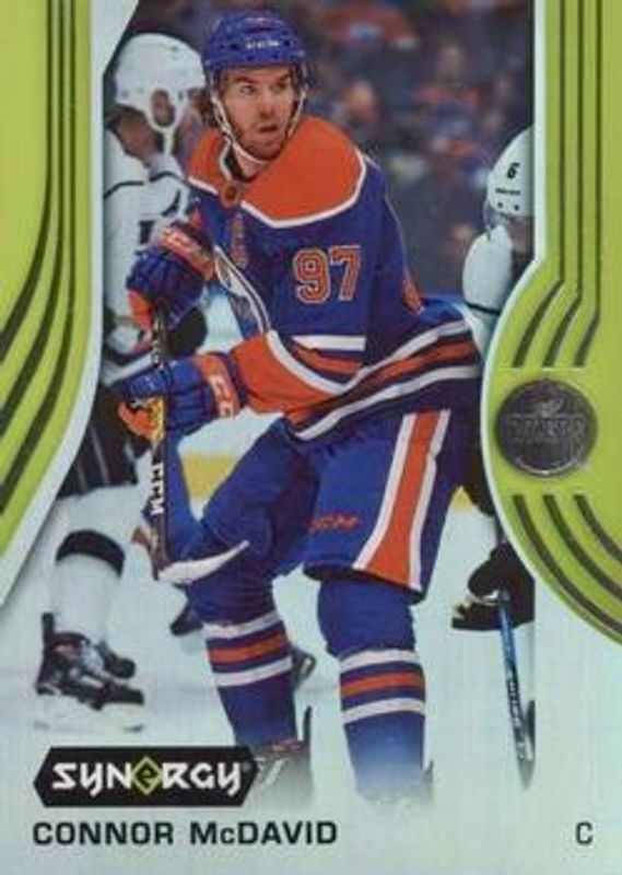 The Connor McDavid 2019 Upper Deck Synergy #1 Green /299 card is 1 of 29 Connor McDavid's card variations in the 2019 Upper Deck Synergy set being tracked by Sports Card Investor, including #1 Base /19, #36 Base /19, #1 Red, #36 Red, and #36 Red Bounty.