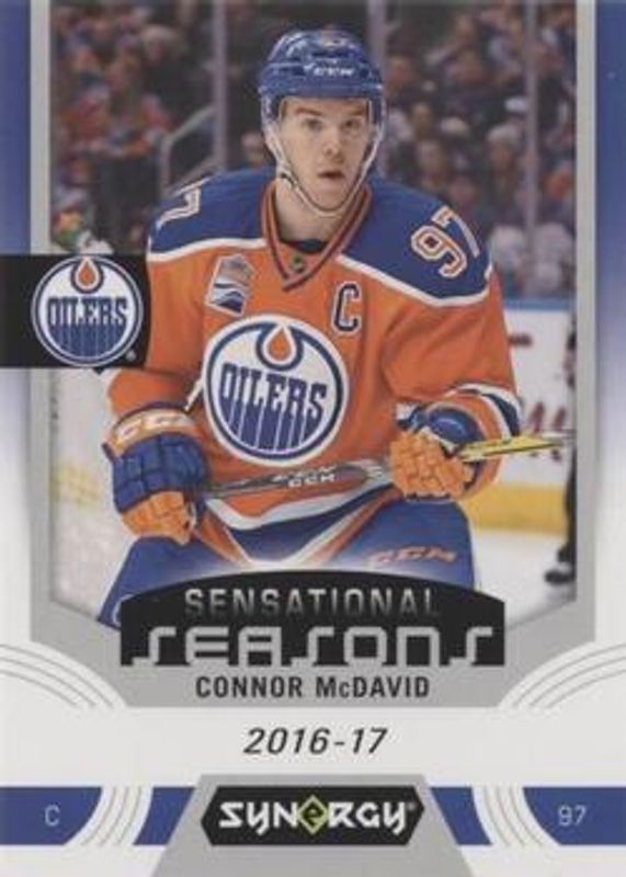 The Connor McDavid 2019 Upper Deck Synergy #SS-8 Sensational Seasons card is 1 of 29 Connor McDavid's card variations in the 2019 Upper Deck Synergy set being tracked by Sports Card Investor, including #1 Base /19, #36 Base /19, #1 Red, #36 Red, and #36 Red Bounty.