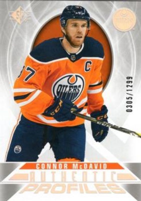 The Connor McDavid 2020 SP #AP-1 Authentic Profiles /2299 card is 1 of 14 Connor McDavid's card variations in the 2020 SP set being tracked by Sports Card Investor, including Base /2299, Blue, Authentic Profiles - Blue, Authentic Profiles Jersey, and Authentic Profiles - Pyrotechnic Gold.