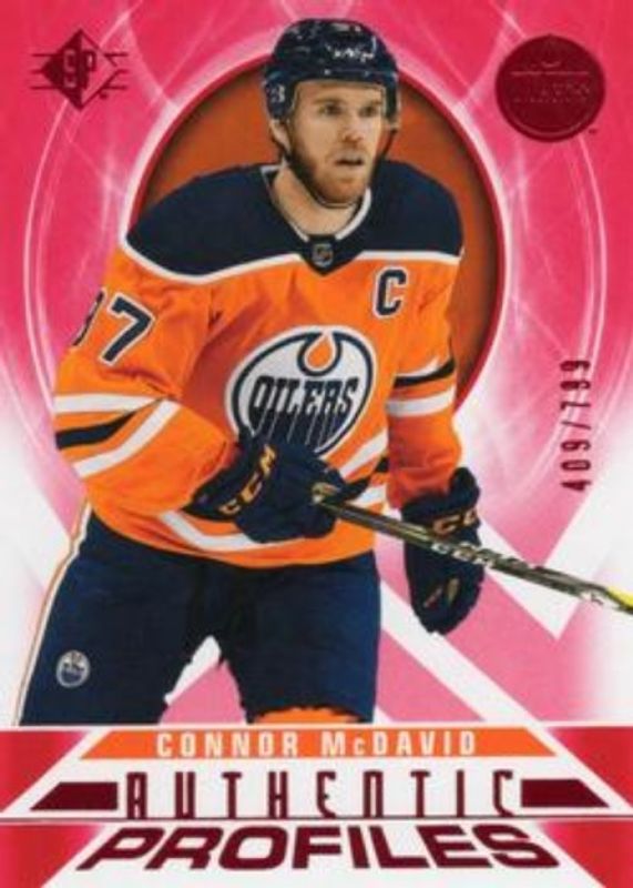 The Connor McDavid 2020 SP #AP-1 Authentic Profiles - Red /799 card is 1 of 14 Connor McDavid's card variations in the 2020 SP set being tracked by Sports Card Investor, including Base /2299, Blue, Authentic Profiles - Blue, Authentic Profiles Jersey, and Authentic Profiles - Pyrotechnic Gold.