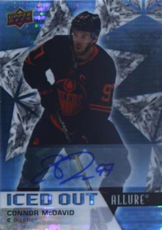The Connor McDavid 2021 Upper Deck Allure #IO-1 Iced Out Autographs card is 1 of 48 Connor McDavid's card variations in the 2021 Upper Deck Allure set being tracked by Sports Card Investor, including Base, Black Rainbow, Blue China, Orange Slice die-cut, and Pink Blue Leopard.
