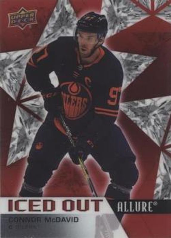 The Connor McDavid 2021 Upper Deck Allure #IO-1 Iced Out card is 1 of 48 Connor McDavid's card variations in the 2021 Upper Deck Allure set being tracked by Sports Card Investor, including Base, Black Rainbow, Blue China, Orange Slice die-cut, and Pink Blue Leopard.