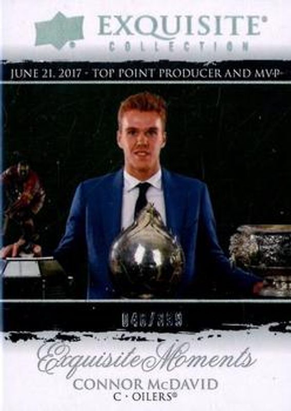 The Connor McDavid 2021 Upper Deck Black Diamond #ECM-CM Exquisite Collection Moments /399 card is 1 of 30 Connor McDavid's card variations in the 2021 Upper Deck Black Diamond set being tracked by Sports Card Investor, including Base /349, Premium Relics /50, Pure Black /50, Diamond Relics /5, and Diamond Relics Pure Black /1.