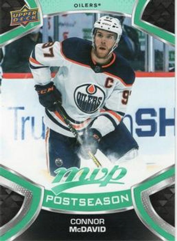 The Connor McDavid 2021 Upper Deck MVP #PS1 Postseason card is 1 of 41 Connor McDavid's card variations in the 2021 Upper Deck MVP set being tracked by Sports Card Investor, including Base, Blue, Gold Script, Ice Battles, and Silver Script.