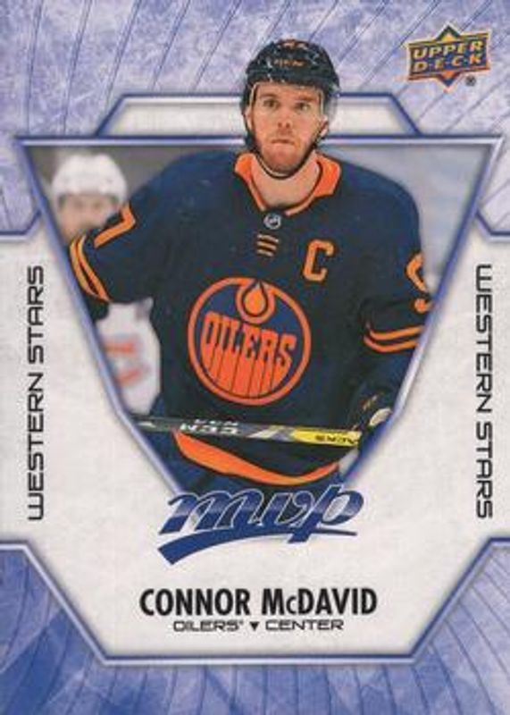 The Connor McDavid 2021 Upper Deck MVP #WS-1 Western Stars card is 1 of 41 Connor McDavid's card variations in the 2021 Upper Deck MVP set being tracked by Sports Card Investor, including Base, Blue, Gold Script, Ice Battles, and Silver Script.