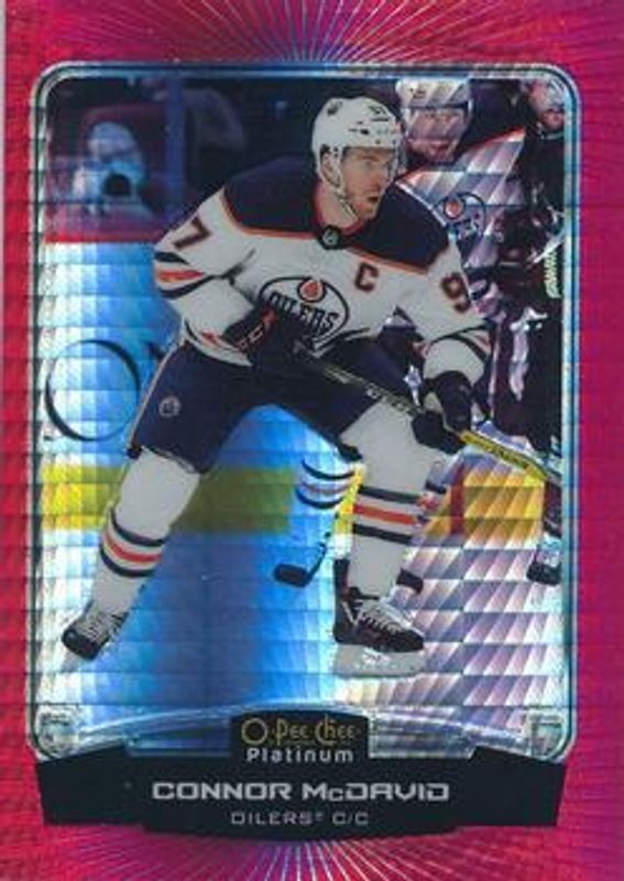 The Connor McDavid 2022 O-Pee-Chee #P-CM O-Pee-Chee Platinum Previews - Red Prism /50 card is 1 of 57 Connor McDavid's card variations in the 2022 O-Pee-Chee set being tracked by Sports Card Investor, including #500 Base, #97 Base, #97b Base, #97c Base, and #501 Blue Border.