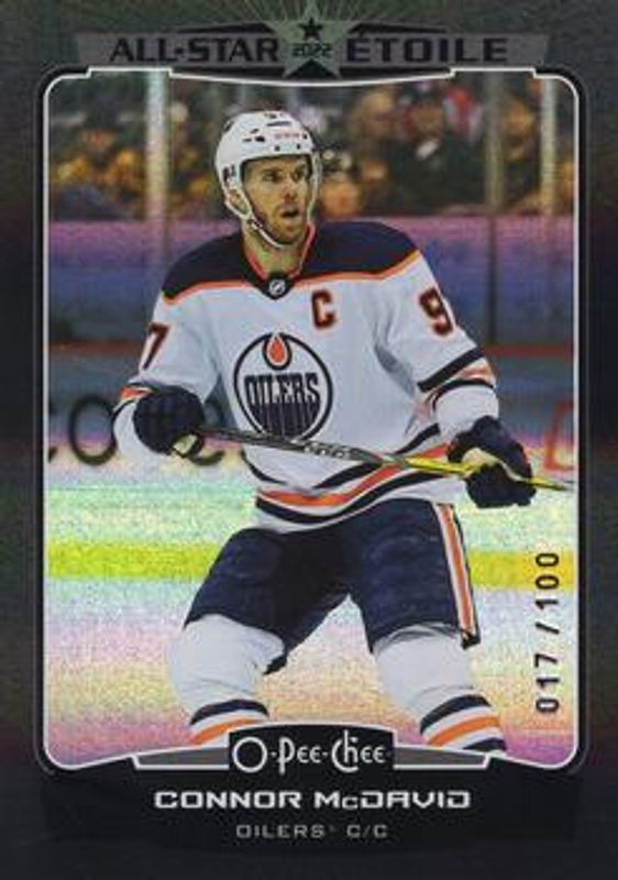 The Connor McDavid 2022 O-Pee-Chee #501 Rainbow Black /100 card is 1 of 57 Connor McDavid's card variations in the 2022 O-Pee-Chee set being tracked by Sports Card Investor, including #500 Base, #97 Base, #97b Base, #97c Base, and #501 Blue Border.
