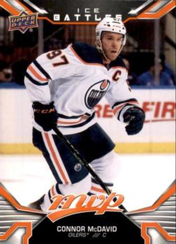 The Connor McDavid 2022 Upper Deck MVP #220 Ice Battles card is 1 of 41 Connor McDavid's card variations in the 2022 Upper Deck MVP set being tracked by Sports Card Investor, including Base, Blue Script, Gold Script, Silver Script, and Super Script /25.