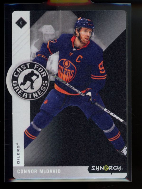 The Connor McDavid 2023 Upper Deck Synergy #CG-1 Cast For Greatness card is 1 of 39 Connor McDavid's card variations in the 2023 Upper Deck Synergy set being tracked by Sports Card Investor, including Base /24, Red, Red Codes, Purple /99, and Gold /25.