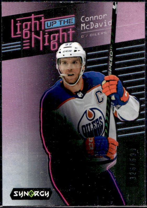 The Connor McDavid 2023 Upper Deck Synergy #LN-MC Light Up the Night - Pink /699 card is 1 of 39 Connor McDavid's card variations in the 2023 Upper Deck Synergy set being tracked by Sports Card Investor, including Base /24, Red, Red Codes, Purple /99, and Gold /25.