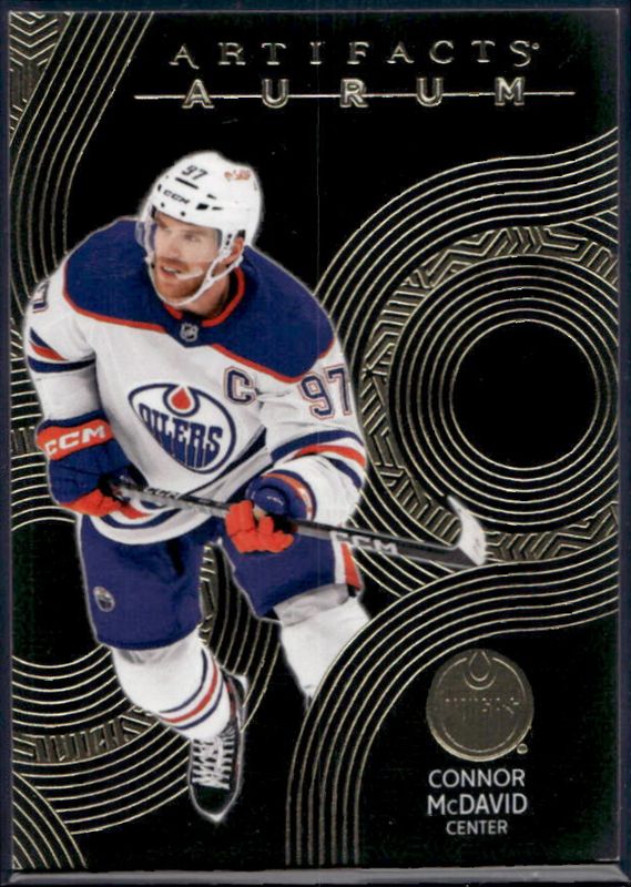The Connor McDavid 2024 Upper Deck Artifacts #A-CM Aurum card is 1 of 30 Connor McDavid's card variations in the 2024 Upper Deck Artifacts set being tracked by Sports Card Investor, including Foilboard, Foilboard Gold, Neon Green, Plexi, and Silver /699.