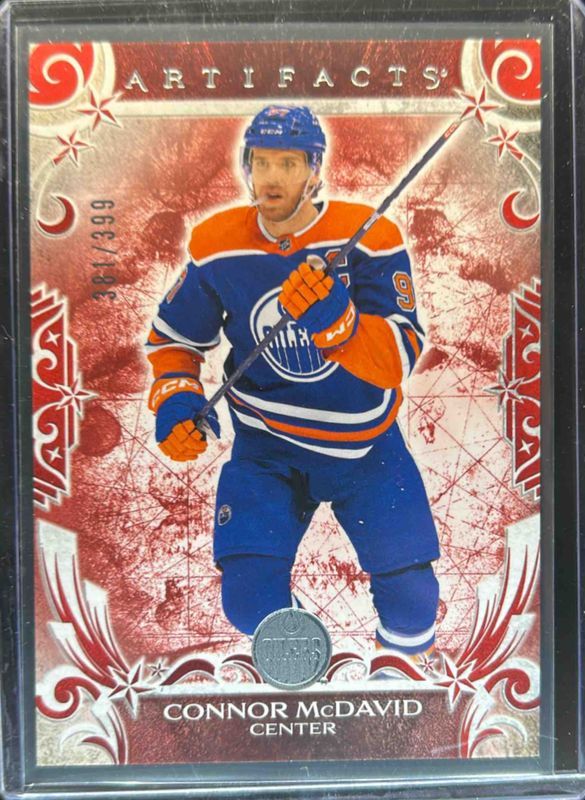 The Connor McDavid 2024 Upper Deck Artifacts #152 Ruby /399 card is 1 of 30 Connor McDavid's card variations in the 2024 Upper Deck Artifacts set being tracked by Sports Card Investor, including Foilboard, Foilboard Gold, Neon Green, Plexi, and Silver /699.