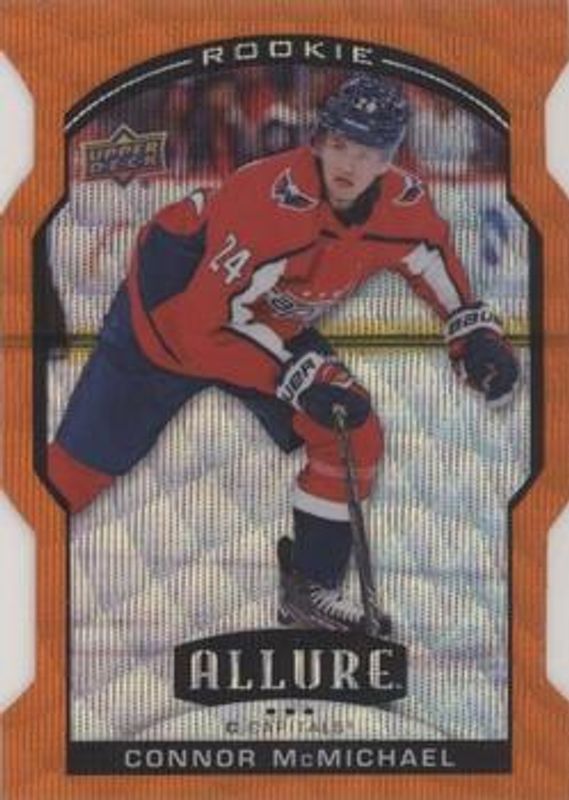 The Connor McMichael 2020 Upper Deck Allure #94 Orange Slice Rookie card is 1 of 53 Connor McMichael's card variations in the 2020 Upper Deck Allure set being tracked by Sports Card Investor, including #131 Base, #94 Base, #94 2005 Shield, #94 Black Rainbow, and #94 Blue China.