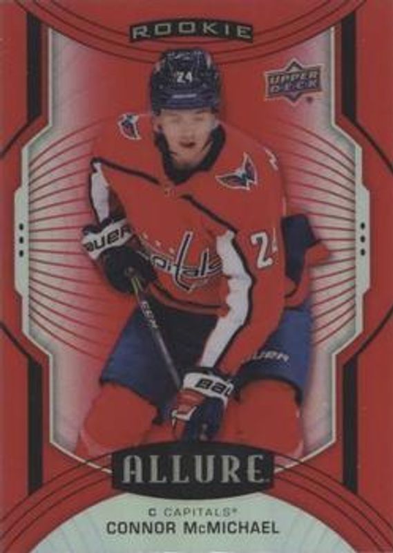 The Connor McMichael 2020 Upper Deck Allure #131 Red Rainbow Rookie card is 1 of 53 Connor McMichael's card variations in the 2020 Upper Deck Allure set being tracked by Sports Card Investor, including #131 Base, #94 Base, #94 2005 Shield, #94 Black Rainbow, and #94 Blue China.