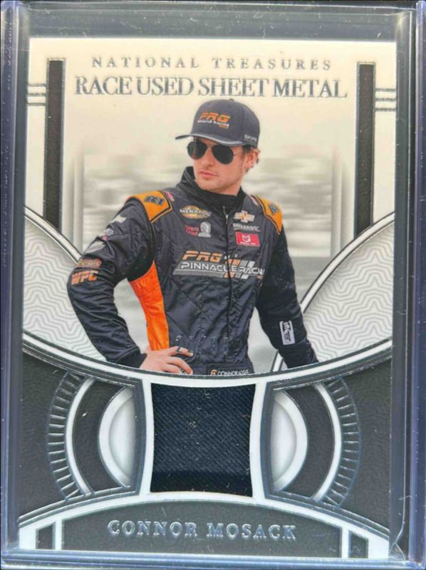 The Connor Mosack 2024 National Treasures NASCAR #RUS-CMK Race Used Sheet Metal /99 Rookie card is 1 of 51 Connor Mosack's card variations in the 2024 National Treasures NASCAR set being tracked by Sports Card Investor, including Base /49, Silver Holo /25, Stars & Stripes /13, Gold Holo /10, and Green /5.