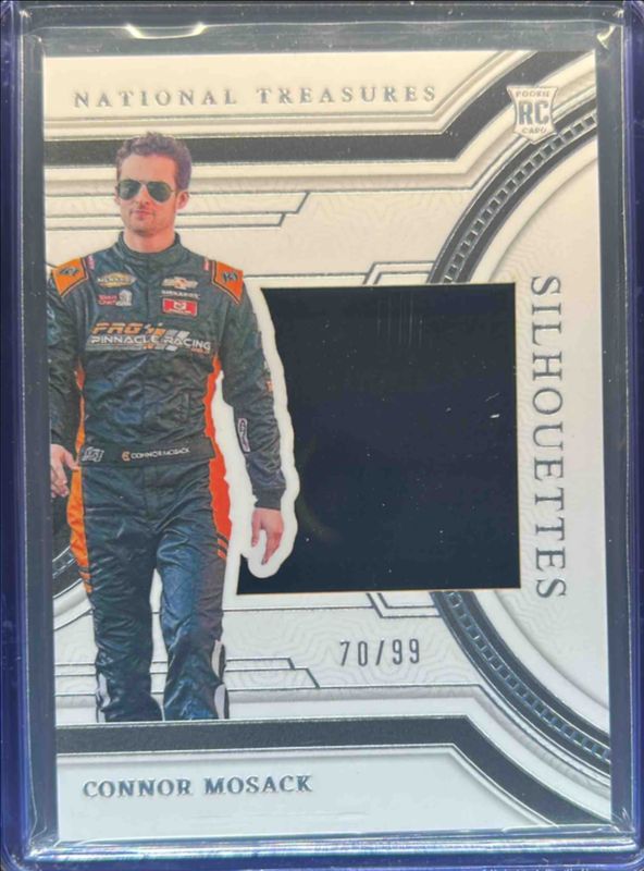The Connor Mosack 2024 National Treasures NASCAR #SS-CMK Silhouettes /99 Rookie card is 1 of 51 Connor Mosack's card variations in the 2024 National Treasures NASCAR set being tracked by Sports Card Investor, including Base /49, Silver Holo /25, Stars & Stripes /13, Gold Holo /10, and Green /5.