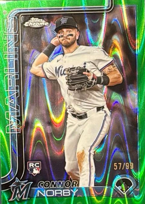 The Connor Norby 2025 Topps Chrome #199 Green RayWave Refractor /99 Rookie card in Raw condition has not changed in price in the last 30 days and was last sold for $5.50 .