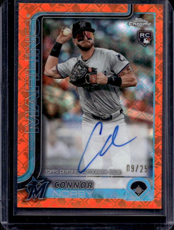 The Connor Norby 2025 Topps Chrome Logofractor Edition #RA-CN Rookie Autographs - Orange Refractor /25 card is 1 of 36 Connor Norby's card variations in the 2025 Topps Chrome Logofractor Edition set being tracked by Sports Card Investor, including Base, Image Variation, Image Variation - Purple Refractor /250, Purple Refractor /250, and Aqua Refractor /199.