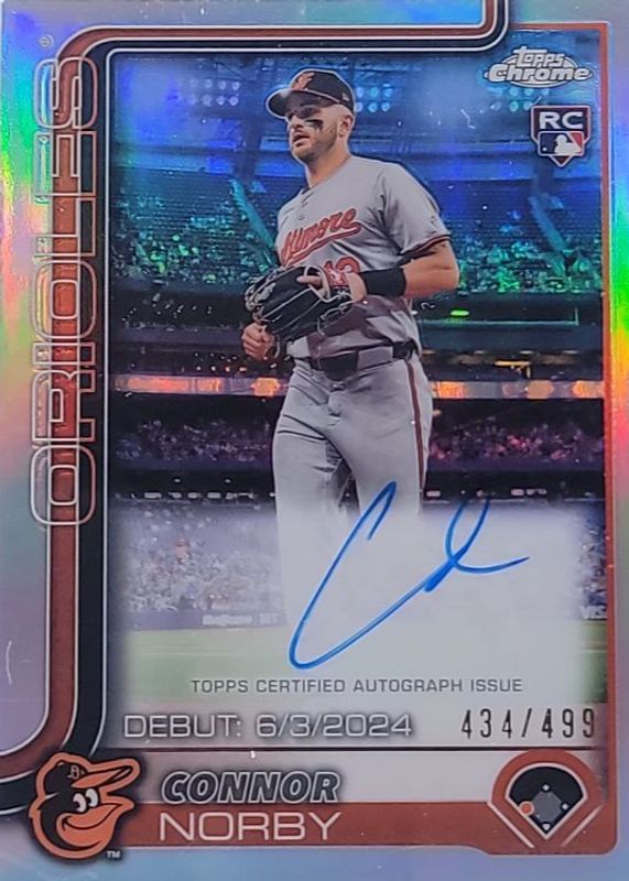 The Connor Norby 2025 Topps Chrome #RA-CN Rookie Autographs - Refractor /499 card in Raw condition has moved up $4.50 (+81.8%) in the last 30 days and was last sold for $10.00 .