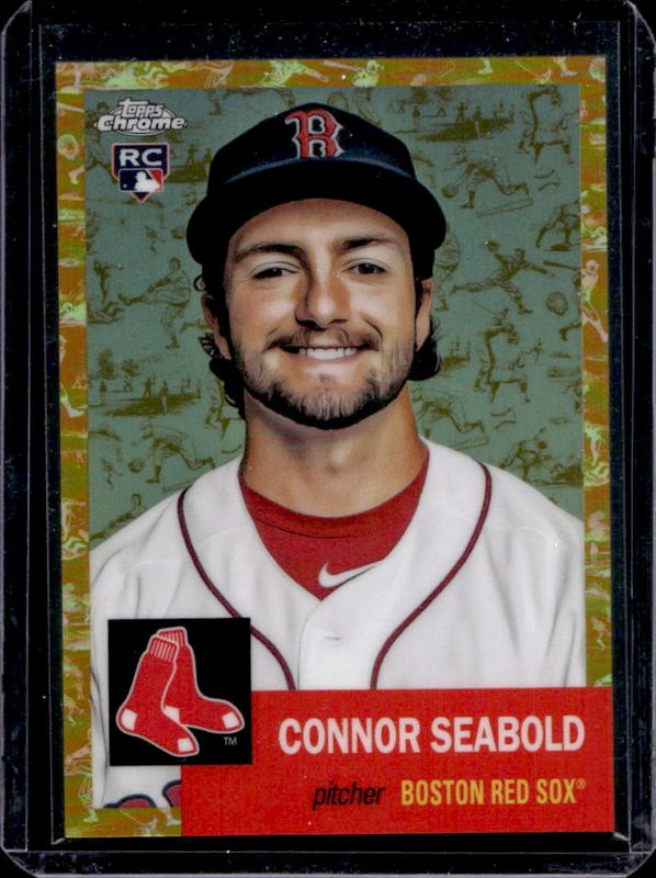 The Connor Seabold 2022 Topps Chrome Platinum Anniversary #330 Platinum Toile Cream Gold Refractor /50 Rookie card is 1 of 34 Connor Seabold's card variations in the 2022 Topps Chrome Platinum Anniversary set being tracked by Sports Card Investor, including Base, Black & White Mini Diamond Refractor, Blue Prism Refractor, Gold Prism Refractor, and Prism Refractor.