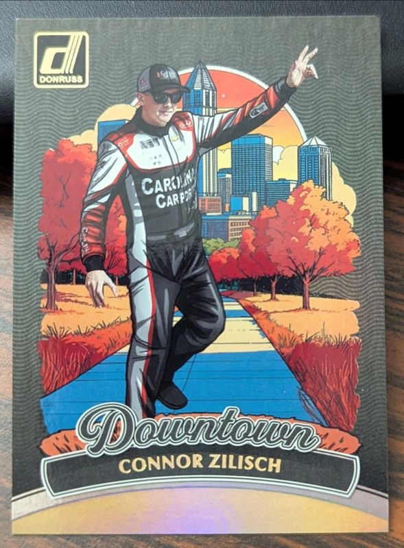 The Connor Zilisch 2025 Donruss NASCAR #3 Downtown /(SSP) card is 1 of 156 Connor Zilisch's card variations in the 2025 Donruss NASCAR set being tracked by Sports Card Investor, including Base, Laser, Red /299, Blue /199, and Lime Green /199.