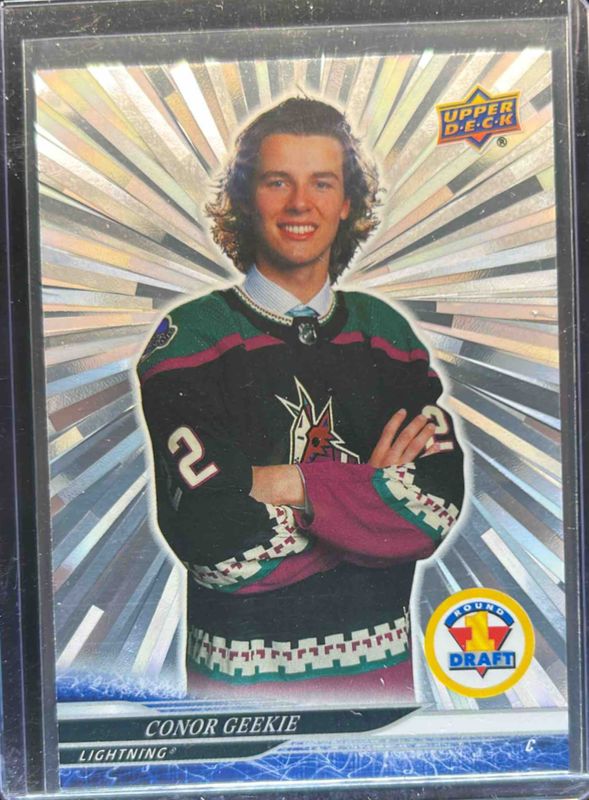 The Conor Geekie 2024 Upper Deck Extended Series #744 Outburst Rookie card is 1 of 37 Conor Geekie's card variations in the 2024 Upper Deck Extended Series set being tracked by Sports Card Investor, including Base, Clear Cut, Deluxe /250, Exclusives /100, and Outburst Red /25.