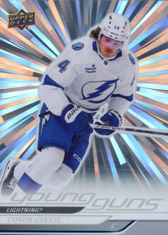 This card is 1 of 8 Conor Geekie's card variations in the 2024 Upper Deck set being tracked by Sports Card Investor, including Young Guns Base, Young Guns - Clear Cut, Young Guns - Deluxe /250, Young Guns - UD Exclusives /100, and Young Guns - Outburst Red /25.