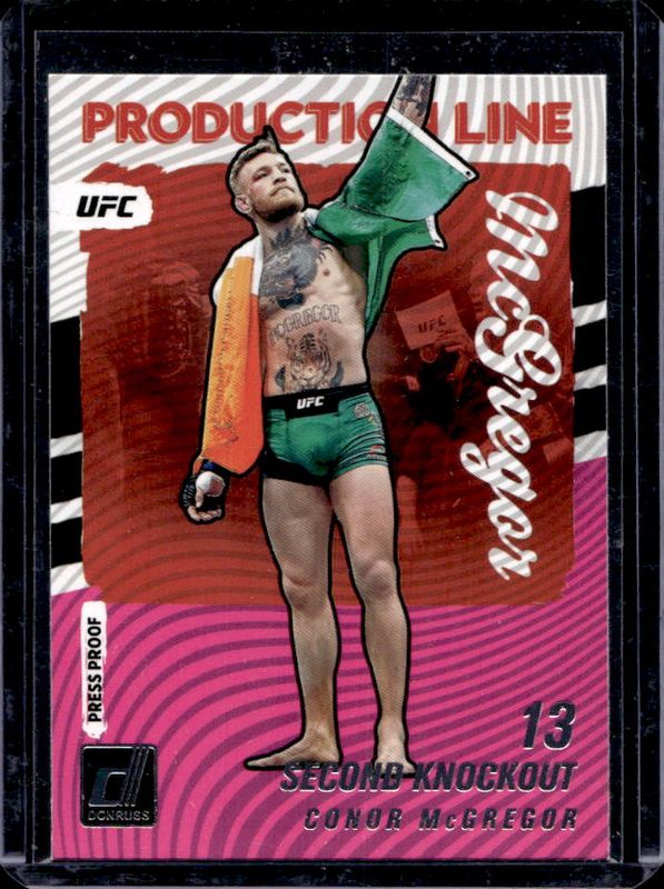 The Conor McGregor 2022 Donruss UFC #1 Magicians Press Proof Pink card is 1 of 61 Conor McGregor's card variations in the 2022 Donruss UFC set being tracked by Sports Card Investor, including Base, Green Flood, Holo Orange Laser, Holo Pink Laser, and Press Proof Purple.