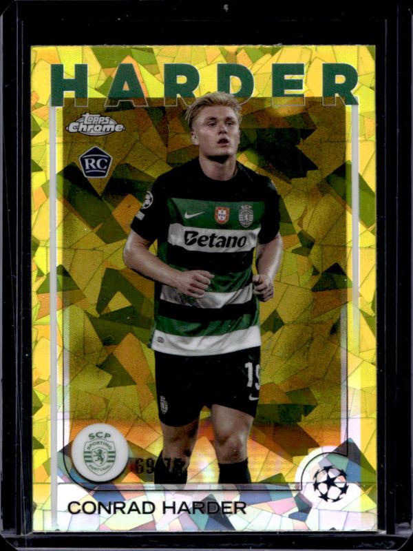 The Conrad Harder 2024 Topps Chrome Sapphire UEFA Club Competitions #177 Yellow /75 Rookie card is 1 of 13 Conrad Harder's card variations in the 2024 Topps Chrome Sapphire UEFA Club Competitions set being tracked by Sports Card Investor, including Base, Green /99, Gold /50, Orange /25, and Black /10.