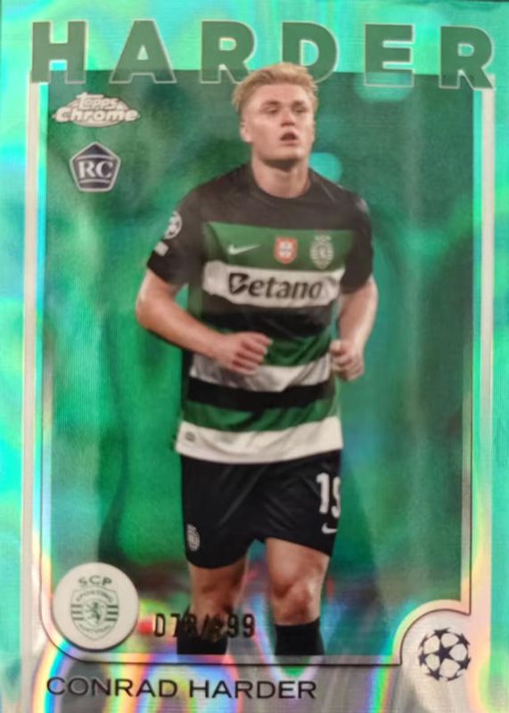 This card is 1 of 44 Conrad Harder's card variations in the 2024 Topps Chrome UEFA Club Competitions set being tracked by Sports Card Investor, including Base, Geometric Refractor, Hongbao Red Refractor, Magenta Shimmer Refractor, and Pulsar Refractor.